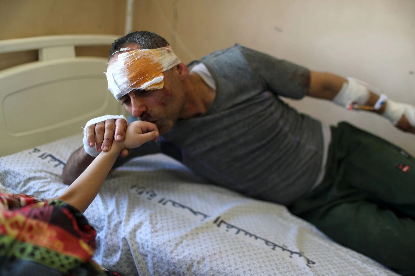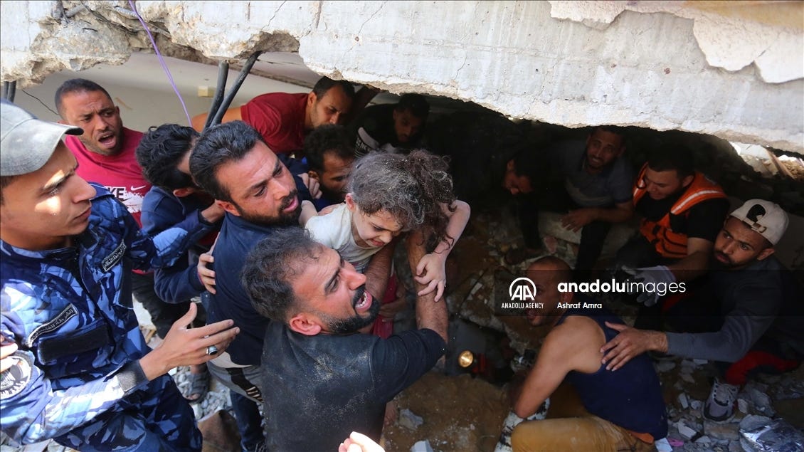 Incredible - harrowing - photograph by Palestinian photographer Ashraf Amra in Gaza. This is six-year-old Suzy Eshkuntana being pulled from the rubble of her home seven hours after an Israeli air raid killed her mother and all four of her siblings. She was later reunited with her father at hospital, as captured by Reuters below.