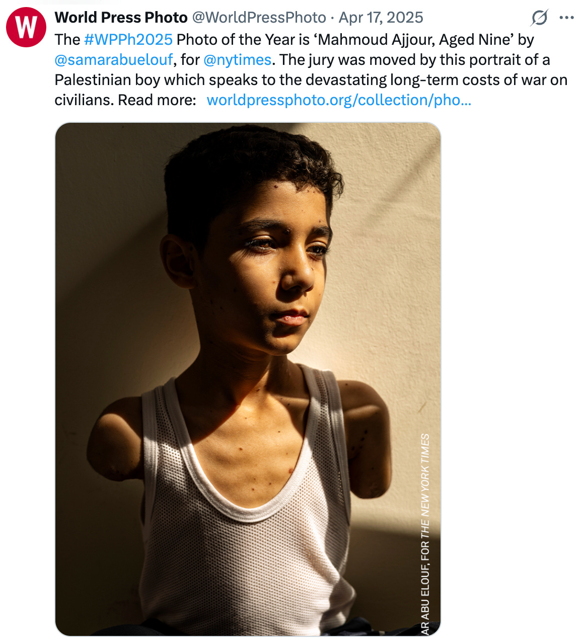 Samar Abu Elouf’s portrait of 9-year-old Mahmoud Ajjour, who lost both of his arms in an Israeli assault, won the prestigious World Press Photo prize last year, but despite that recognition, it failed to achieve widespread attention.